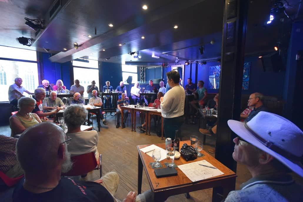 De avond is een semi-serieuze proeverij. “Semi” want een gemoedelijke sfeer en het kennismaken met mooie bieren staat voorop. “Serieus”, want compleet met een proefformulier, en met crackertjes en glazen water om de smaak te neutraliseren tussen de verschillende te proeven bieren.